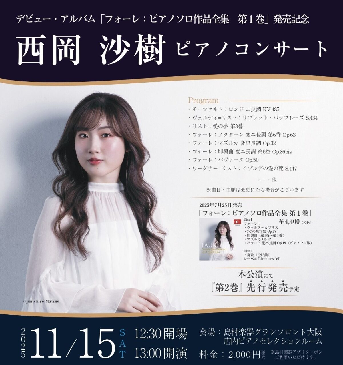 西岡沙樹ピアノコンサート|フォーレ:ピアノソロ作品全集 第1巻 発売記念